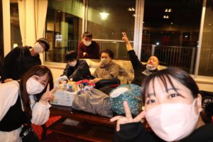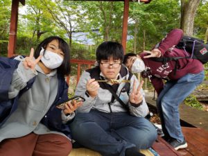 2日目も小雨が降る中ではありましたが、友達同士で回っている生徒や先生グループで行動している生徒もおり、楽しく過ごす様子が見受けられました。残念ながら夜に予定していた「ナイトハイク」と「花火」は中止になってしまいましたが、ホテルのロビーでお話している生徒、卓球をしている生徒、部屋でゆっくり過ごしている生徒と、良い思い出を作ることができました。